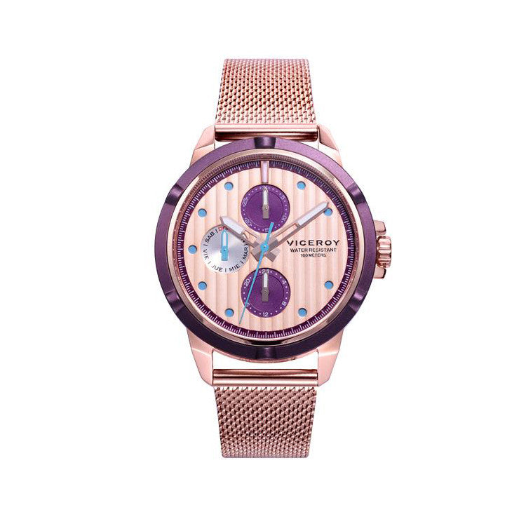 Reloj Viceroy para mujer de la colección Switch fabricado en acero inoxidable con de caja en color burdeos de 38mm de diámetro con esfera rosada con agujas movidas por mecanismo multifunción protegido por cristal mineral.Su correa es de tipo malla milanesa con cierre deslizante. Resistente al agua hasta 100 metros.