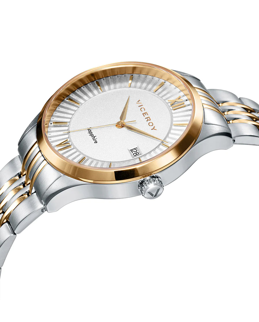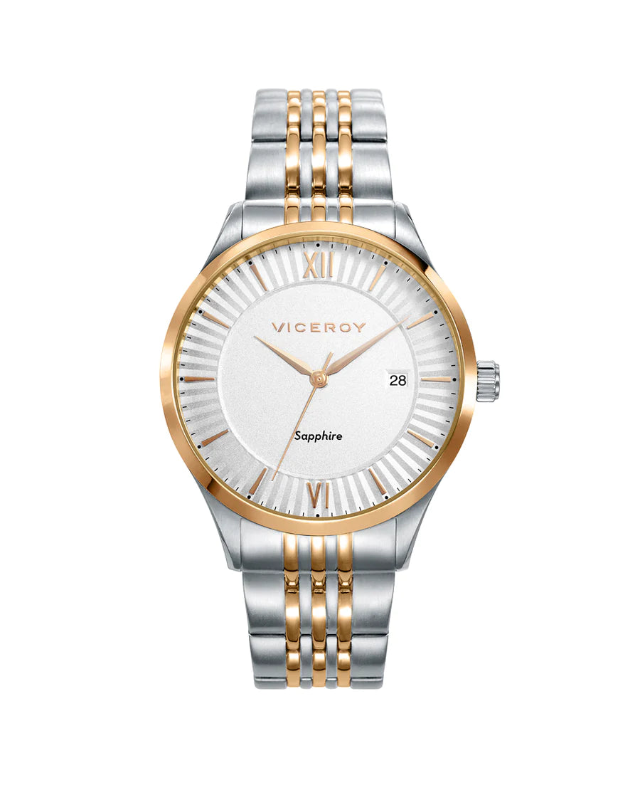 Reloj de Mujer Viceroy Dress tres agujas con la caja y el brazalete de acero bicolor en dorado, con la esfera plateada, los índices en dorado, calendario a las 3 y cristal de zafiro