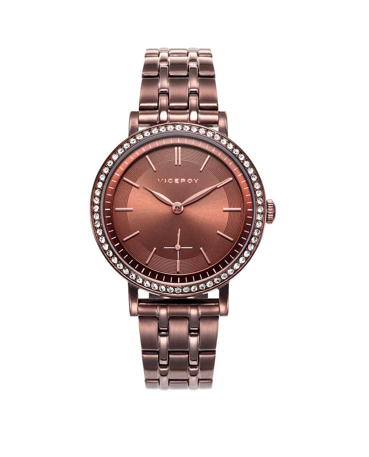 Reloj de mujer Viceroy de 2 agujas con índices, la esfera en IP marrón con circonitas en bisel y el brazalete de acero en IP marrón.